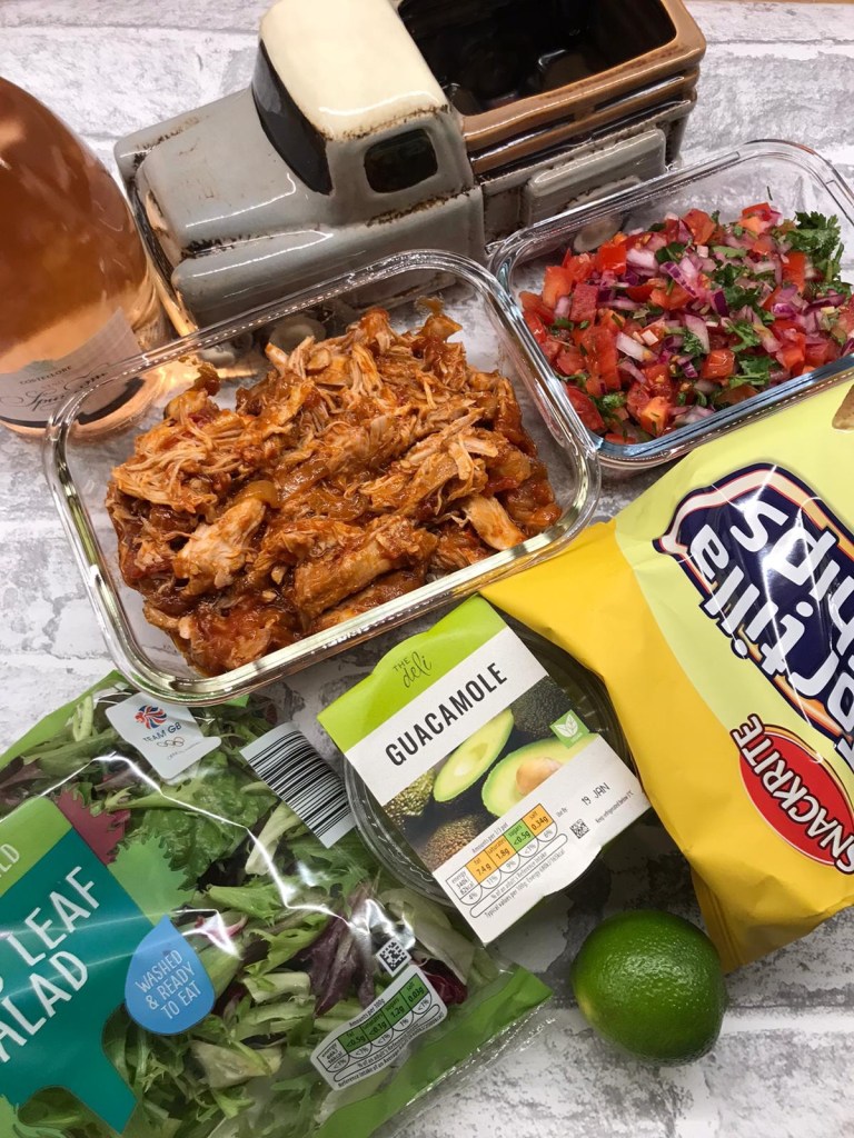 We used chicken, cooked as a Tinga in a rich tomato, garlic and chipotle chilli sauce. The chilli gives a rich deep smoky flavour which is fabulous served with a crisp green salad, tortilla chip, salsa and guacamole.