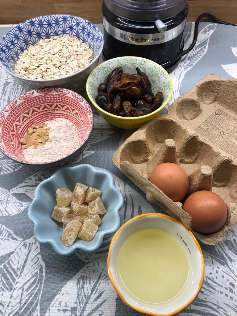 In a food processor whizz the dates, ginger, eggs and oil until smooth.