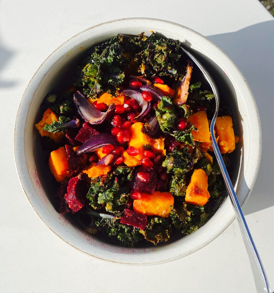 I’m in love with winter veg and this warm ‘salad’ takes the best of them and marries them together. Kale and kalettes, winter squash (which smells like doughnuts when you roast it!) and beetroot, dressed in a sweet and scrumptious dressing and topped with pomegranate. It’s a feast for the eyes and a boost for our immune systems.