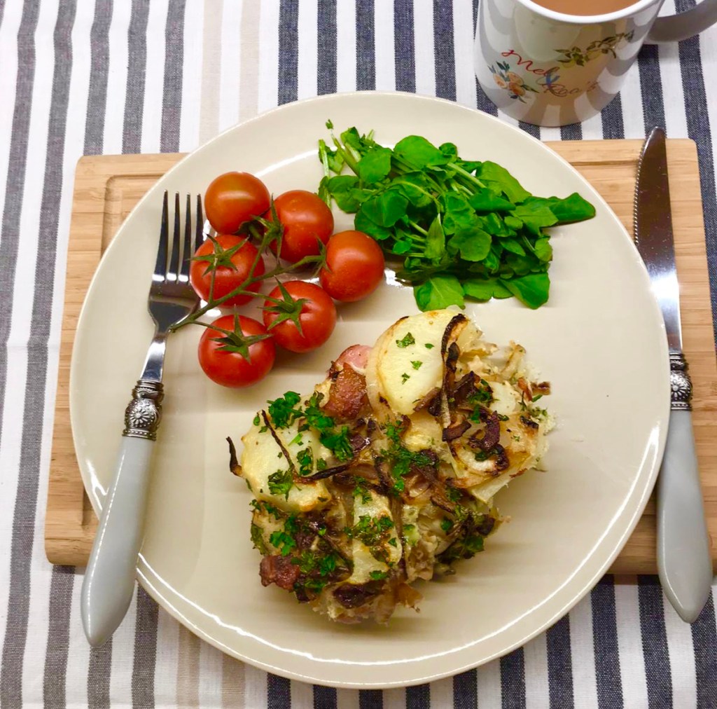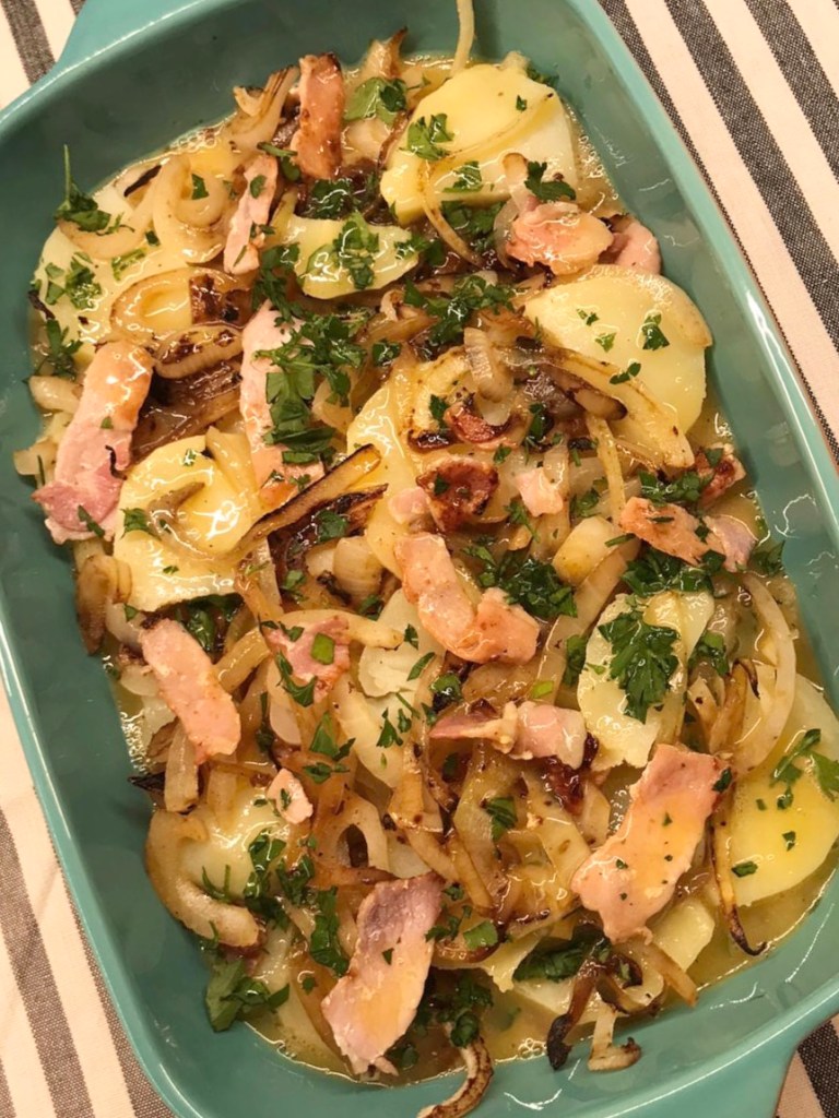 Tender onions, crispy bacon and soft potatoes all cooked together in softly beaten eggs.