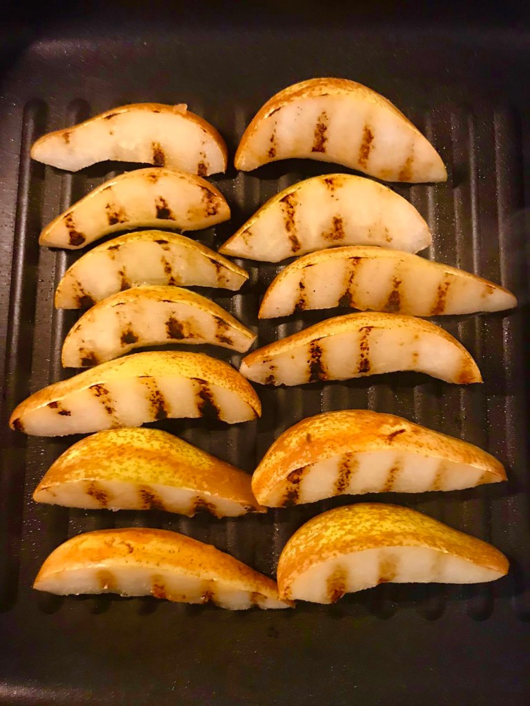 Heat a griddle or frying pan until hot. Spray the pear wedges with the low – fat cooking spray and cook, turning in the hot pan for 2 – 3 minutes until slightly softened and striped.