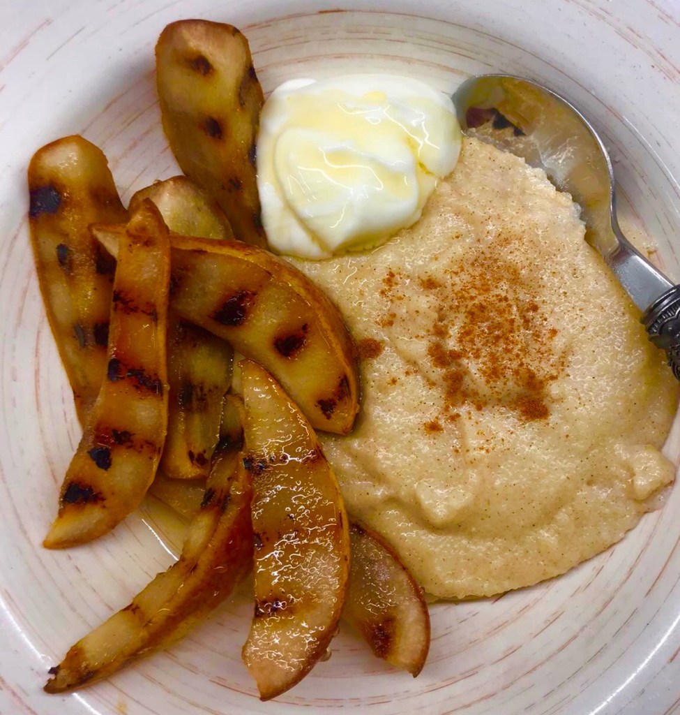 Soft semolina pudding infused with warming cinnamon served with chargrilled pears, drizzled with lemon juice and honey and served with low fat crème fraiche.