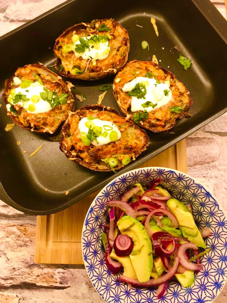 Mash the potato flesh with the cheese, fajita spice mix, most of the spring onions and the coriander stalks. Spoon the filling into the crisp potato skins, top with the grated cheese and put them back in the oven for another 15 minutes or until golden brown and crispy.