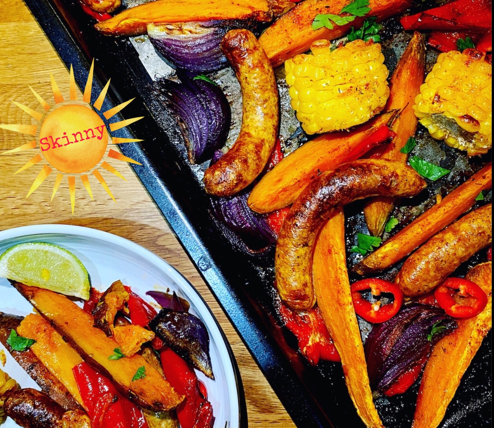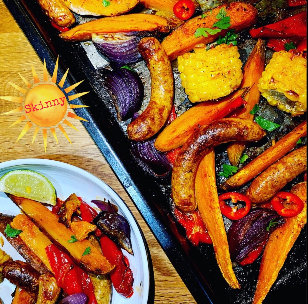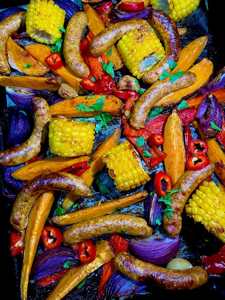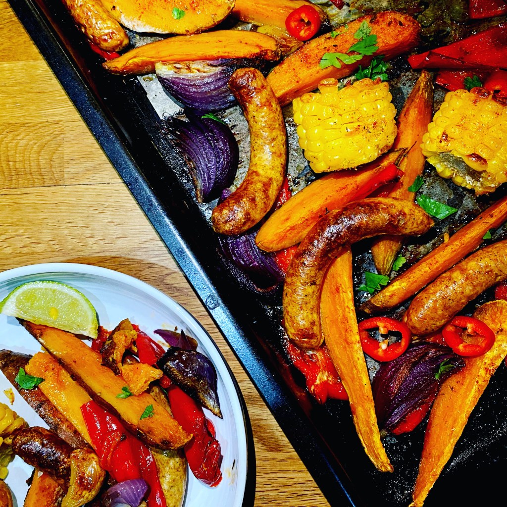 Nestle the sausages amongst the vegetables and bake for 45 mins until the sweet potatoes are tender and the sausages are cooked through.