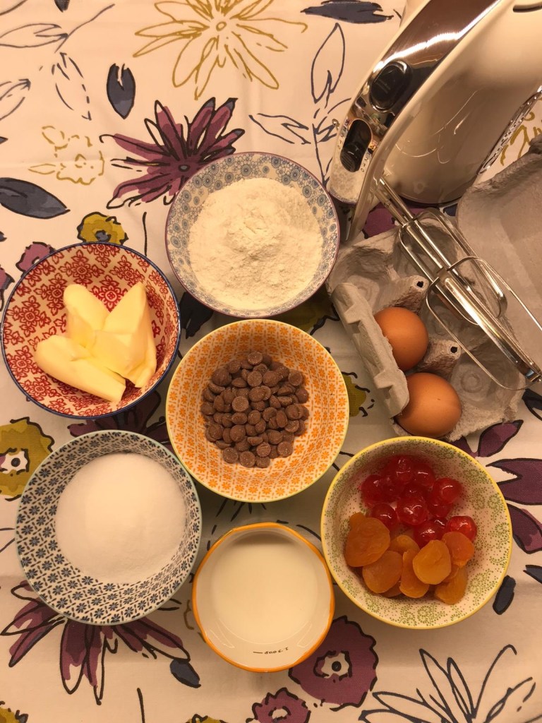 Carefully add the dried fruit and half the chocolate chips, spoon into the tin and smooth the top, then sprinkle over the other half of the chocolate chips and bake at the bottom of the oven for 20 – 25 minutes until well risen and firm to the touch.