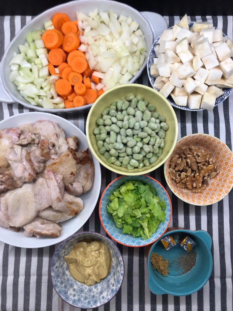 Add the mustard and stir over a high heat until mixture starts to boil and thicken. Add the celeriac and the chicken to the pot and place in the oven with the lid on and cook for 1½ hours.
