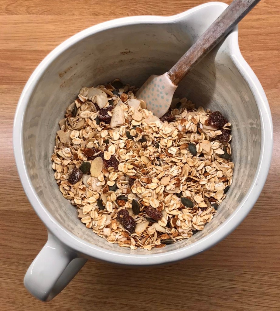 Most shop – brought granolas are very high in fat and sugar. Our version is naturally sweetened with dried Apricots cranberries and contains healthy seeds and nuts, making it a good source of energising carbs.