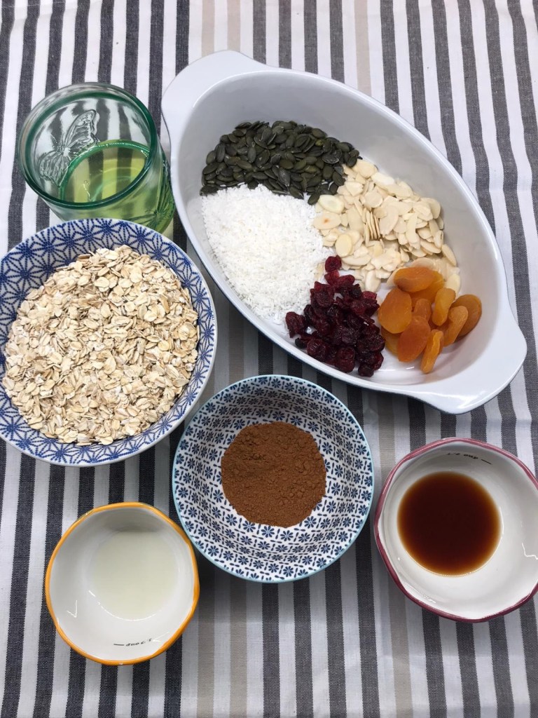 Stir in the oats, cinnamon and vanilla, then fold through the desiccated coconut, almonds ,pumpkin seeds and cranberries.