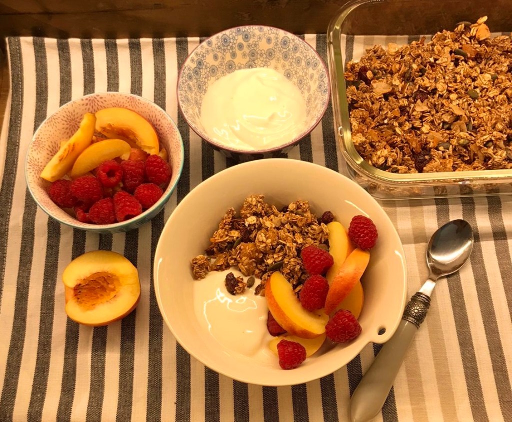 Serve the granola with the bio yogurt topped with the sliced nectarines and raspberries.