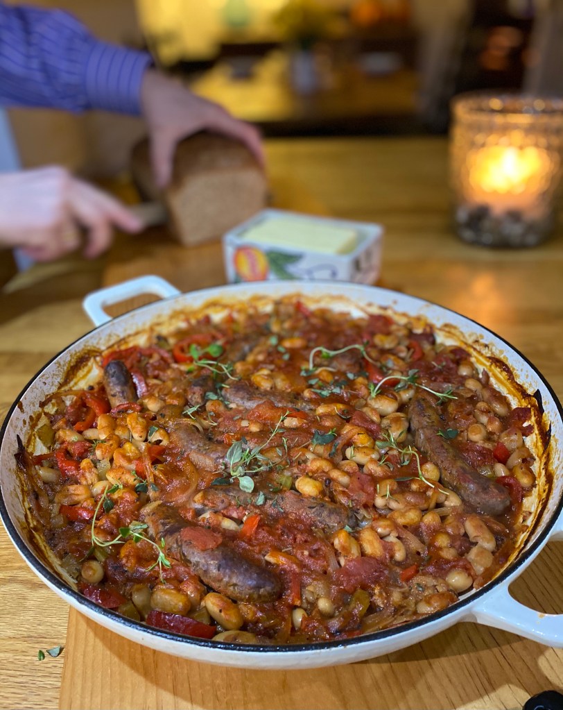Serve the bean and sausage stew with crusty bread or mash, and some lovely, fresh seasonal greens.