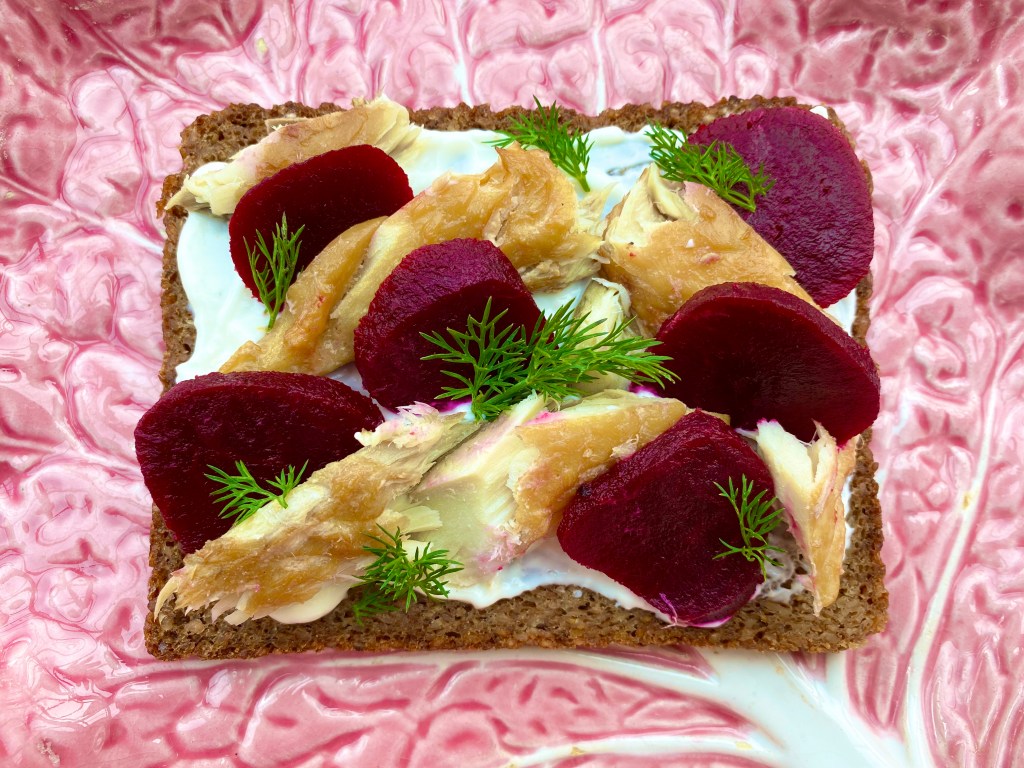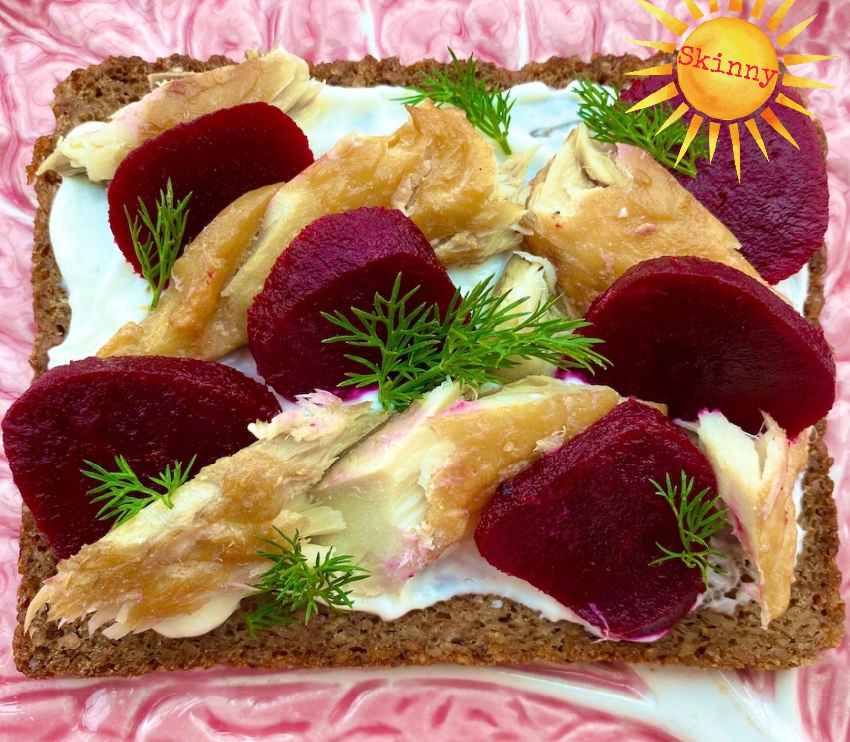 Mackerel is high in Omega 3; proven to support heart health, brain function and vision. Rye bread is a great source of fibre and good for your gut bacteria and beetroot is full of fibre, folate (vitamin B9), manganese, potassium, iron, and vitamin C.