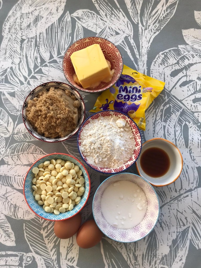 Pour the mixture into the tin, spreading it into the corners. Sprinkle with the mini eggs.