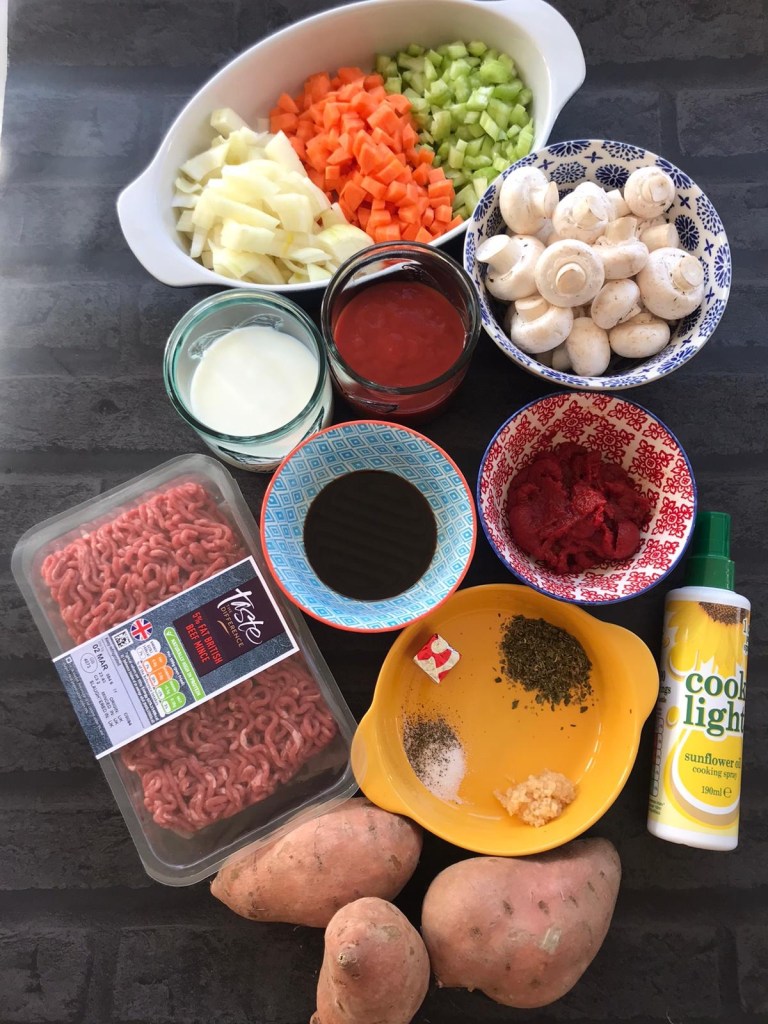 Add the 100ml of milk to the mince, stir to combine and tip into a deep oven – proof dish, top with the sweet potato mash, place in the oven on a baking tray and cook for 45 minutes until the top is brown and bubbling.