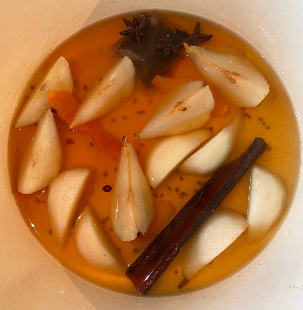 Cover and poach, without boiling, for 10 minutes – carefully turn the pears in the water midway through cooking to prevent browning, test the pears with the point of a sharp knife, if they are soft with just a little bite still left remove the pan from the heat. (If they’re too firm poach for a few minutes more.)