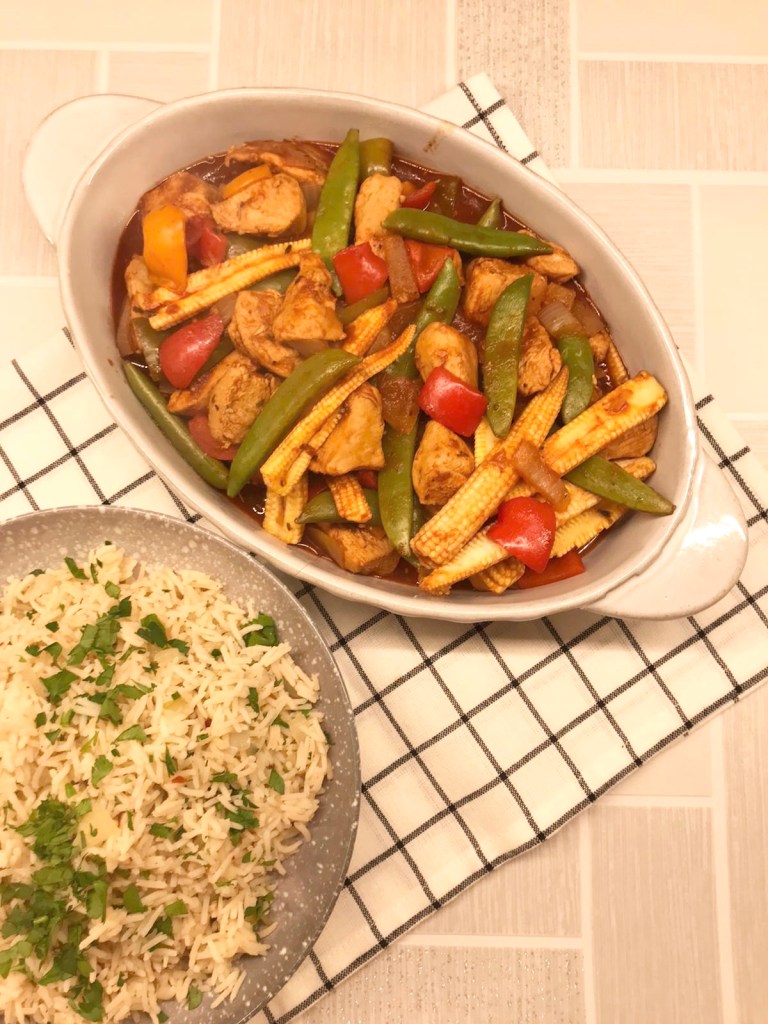 Succulent chunks of lean chicken, peppers, onions, sugar snap peas and baby sweetcorn all cooked together in a rich and full of flavour sauce. 4 of your 5-a-day in just one dish!