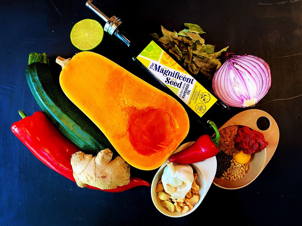 Add the roasted butternut squash, pepper and courgette folding them gently into the curry then squeeze the lime juice into the pan and fold it into the sauce.