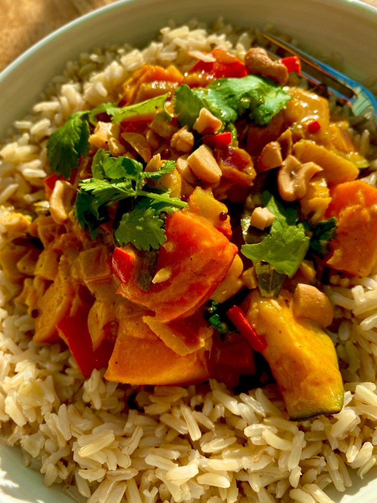 Taste and season then serve with brown rice and the coriander and cashews sprinkled on top.