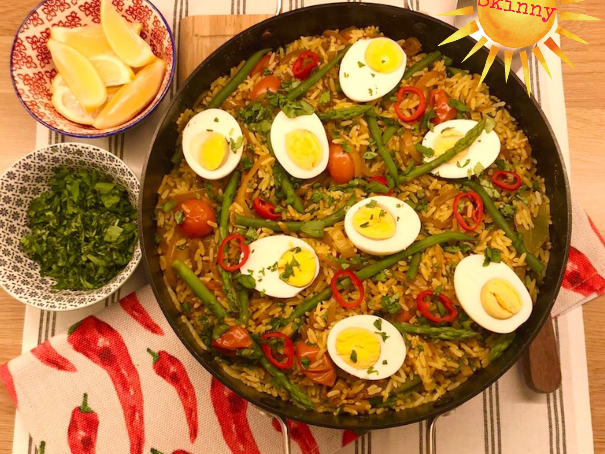 Drain and gently peel the eggs, the slice in half, top the rice mixture with the eggs, coriander, parsley and chilli.