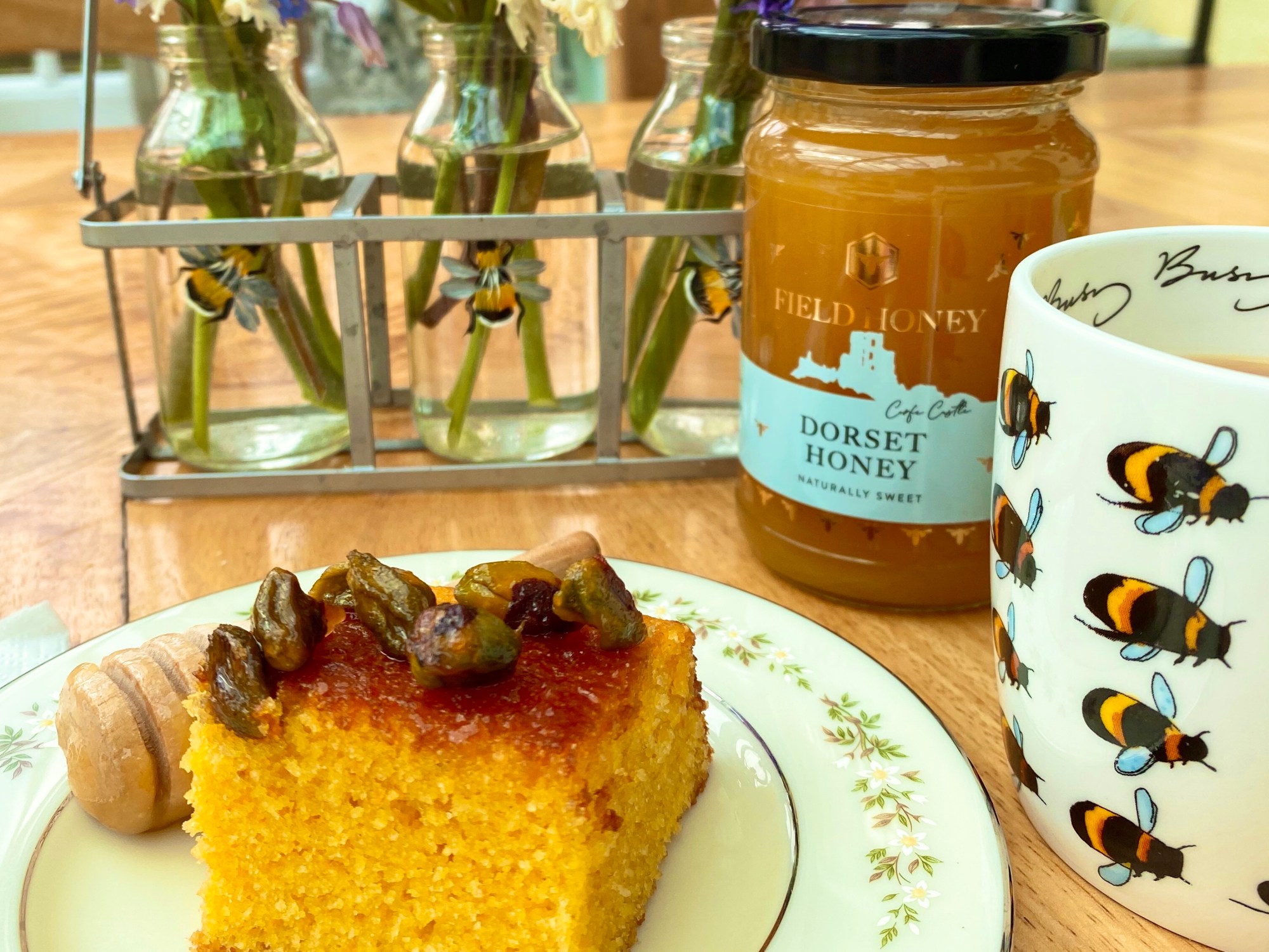 With a skewer, stab the cake all over to create small holes and then pour over the honey pistachio syrup as evenly as possible. Spread the pistachios evenly across the top.