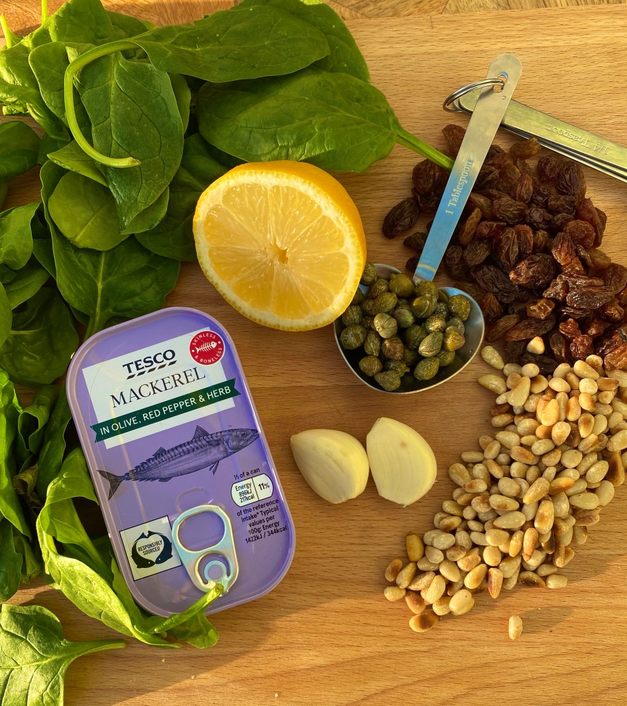 Add the cooked pasta and the lemon juice, stir through then add the mackerel, sultanas, capers and pine nuts, combine, taking care not to break up the mackerel too much.