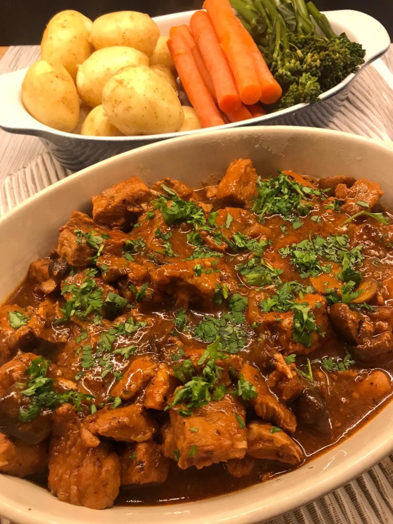 Lean pork, onions, tasty chestnut mushrooms all slow cooked together in a rich garlic and sherry sauce.