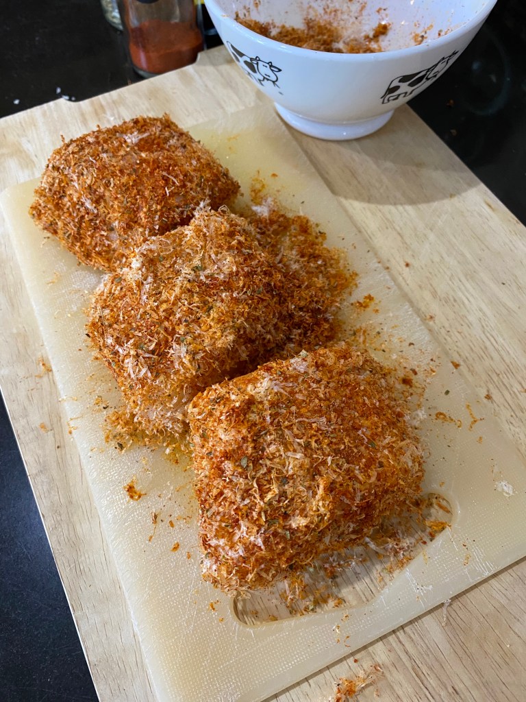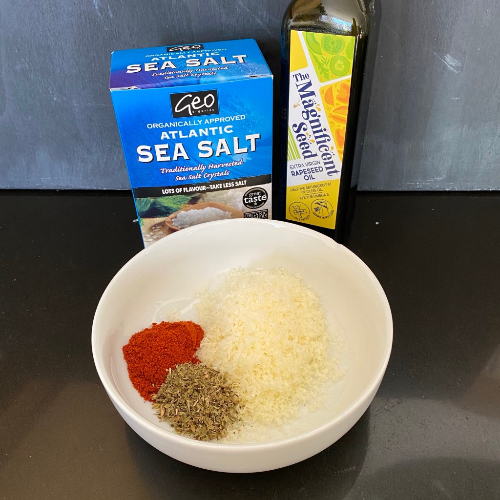 In a small, shallow bowl, mix together the Parmesan, paprika, oregano and salt.