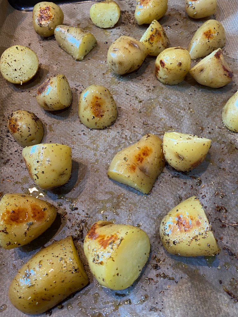 Parboil the new potatoes in lightly salted water for about 8-10 minutes until just staring to soften. Drain well.