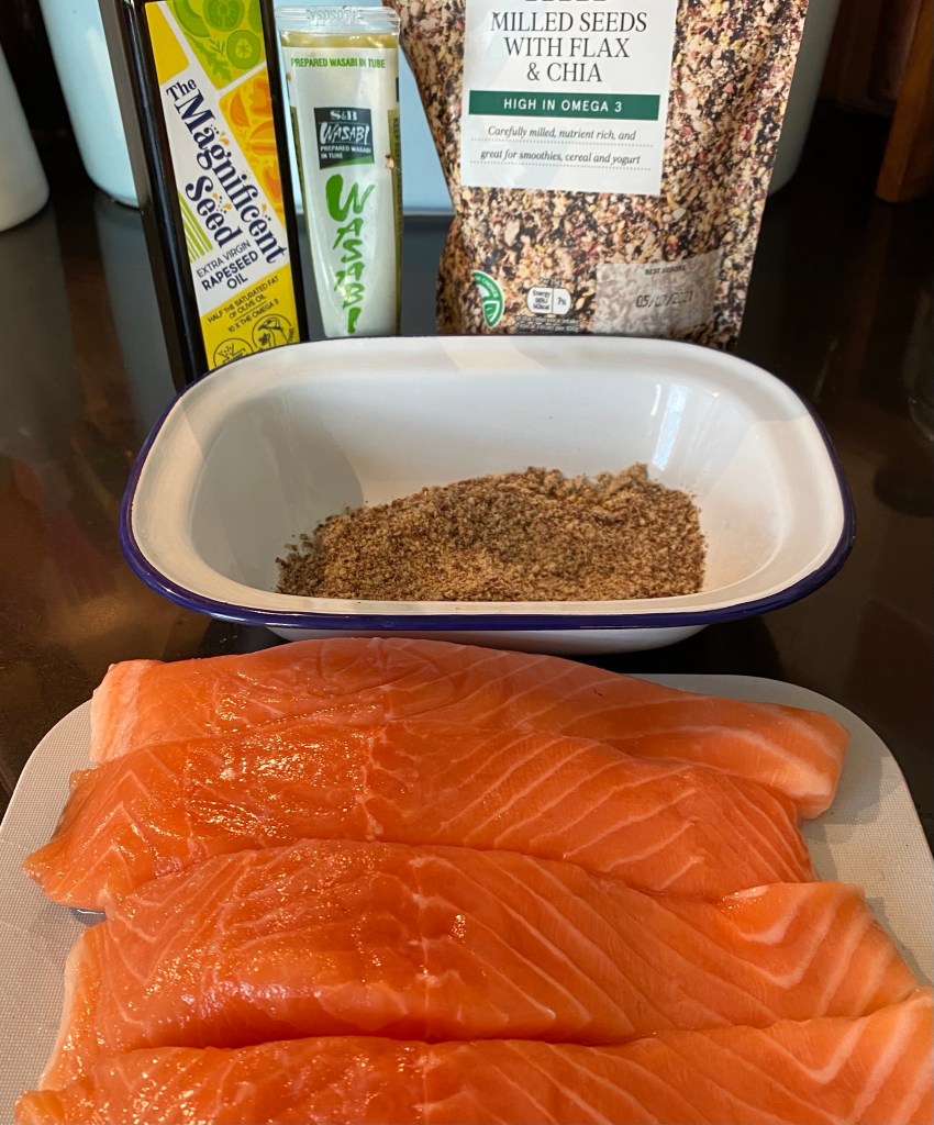 Add the milled seeds to a shallow dish and press the salmon into the mix to coat thoroughly. Any remaining seeds can be scattered over the fillets and pressed in with your fingers.