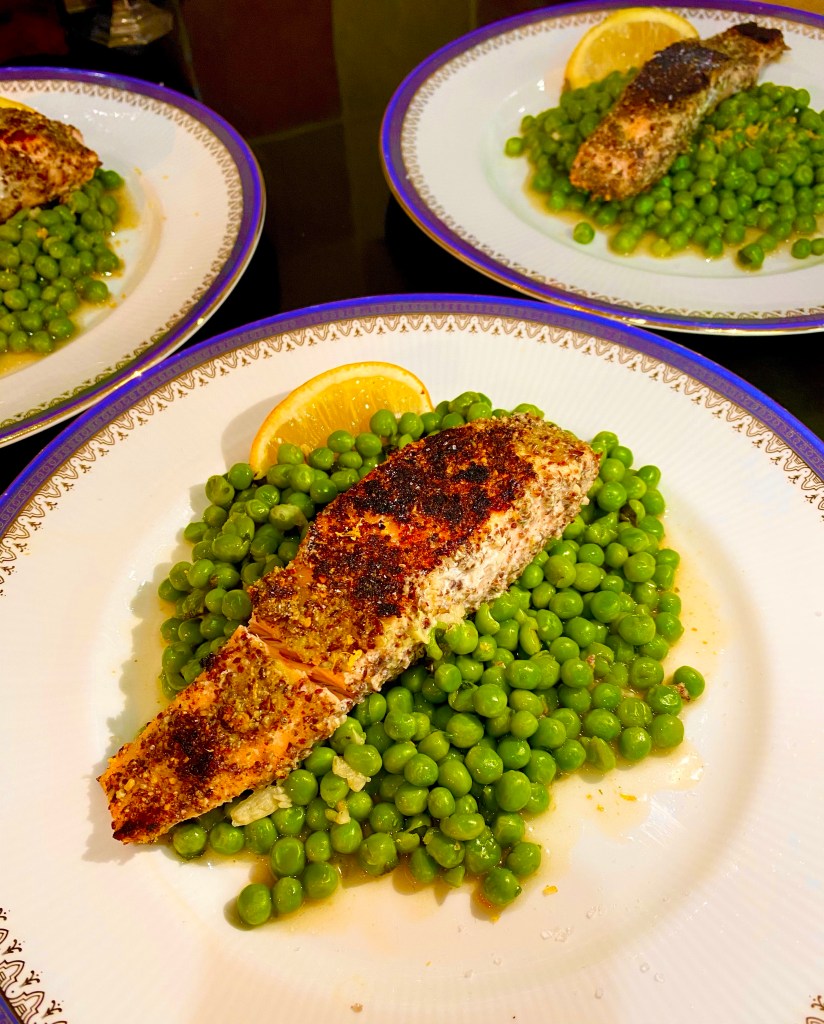 Cooking time will vary depending on thickness of fillets. While the salmon is cooking heat the oil for the pea mash over a low heat and sauté the garlic until aromatic. Add the drained peas and the mint and heat through with the garlic.