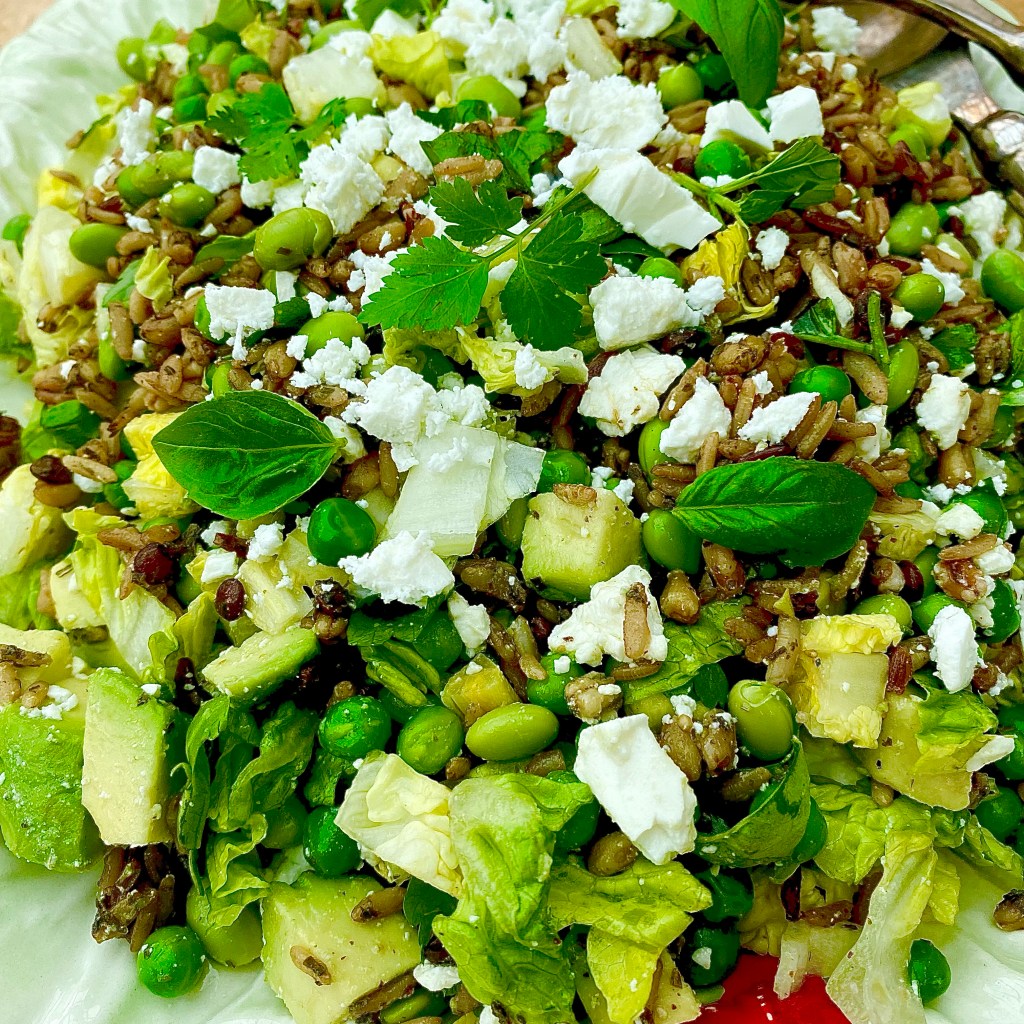Whole grains form the base of this healthy and filling salad, with all things green added; edamame beans, peas, avocado and herbs. It’s full of health giving ingredients and nutritious grains with lovely, salty feta crumbled on top and dressed in a light, zingy dressing.