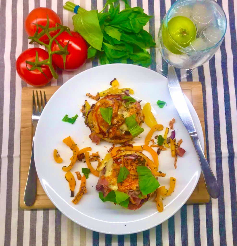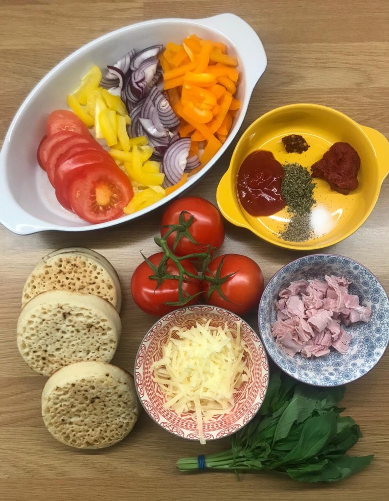 Spread this mixture over the crumpets and top with the peppers, onions, tomato slices and ham, or which ever toppings you choose to use.