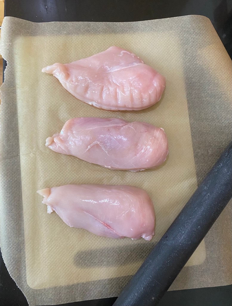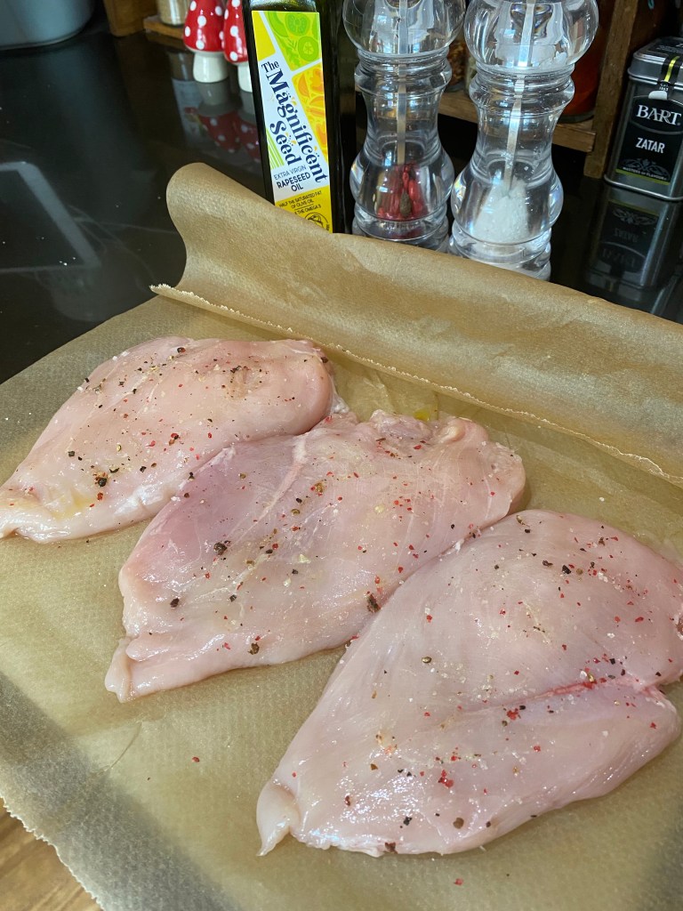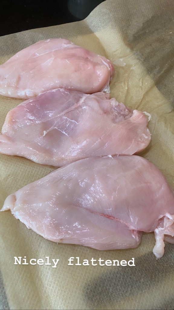 Layout the grease proof paper, enough to fold back over the chicken, and lay out the breasts over half of it, you may need to do this in batches if you’re preparing a lot.