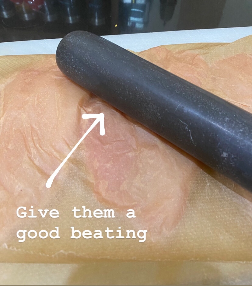 Fold the rest of the paper over and beat the thickest parts of the breasts until they are about 1.5cm thick. This will ensure even cooking throughout.