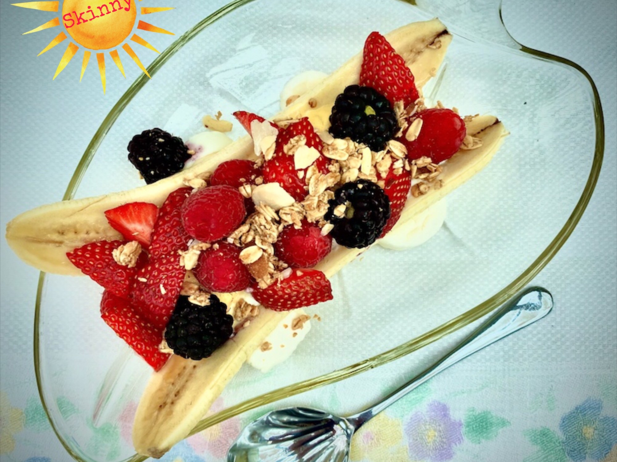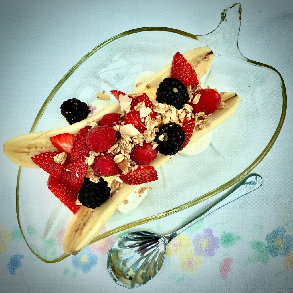 OK so really this could be called just a ‘Banana Split’ but we’ve served it for breakfast as there are all the components for a really good healthy start to the day.