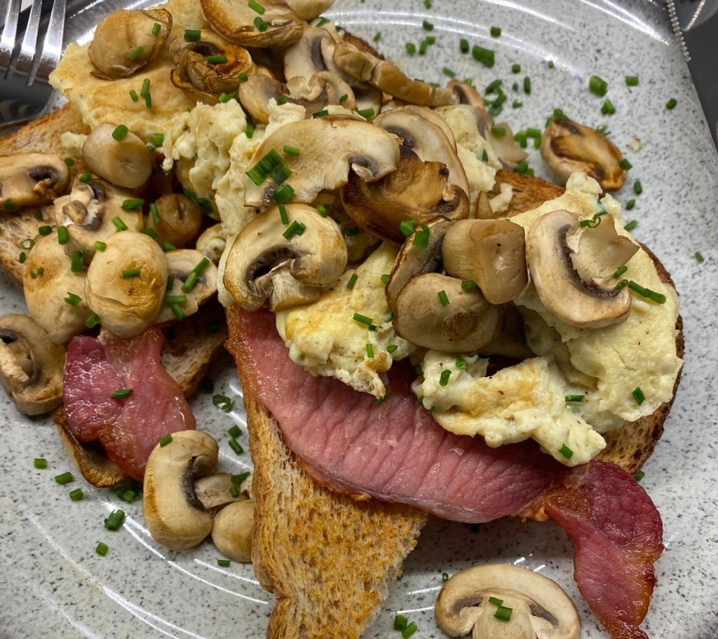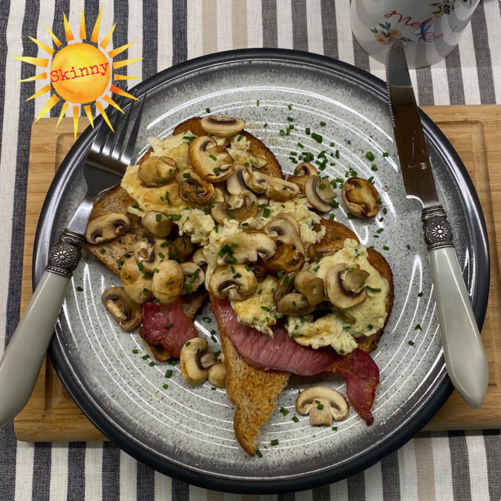 This quick and tasty breakfast or brunch will be a real family favourite. Crisp toast topped with slices of bacon creamy scrambled egg speckled with chopped chives topped with slices of mushrooms.