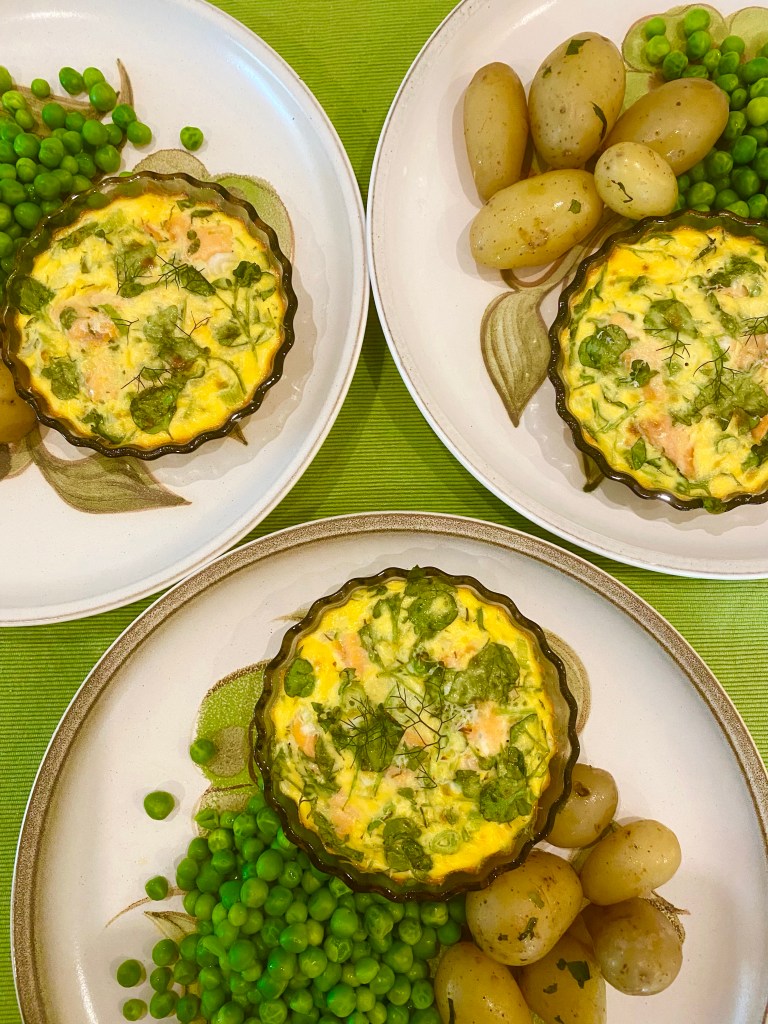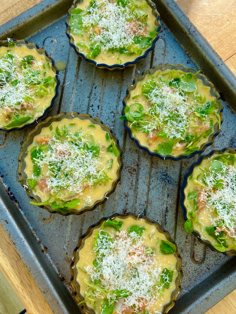 Spray your quiches dish (or dishes) with the low calorie spray and add the salmon and vegetable mix.