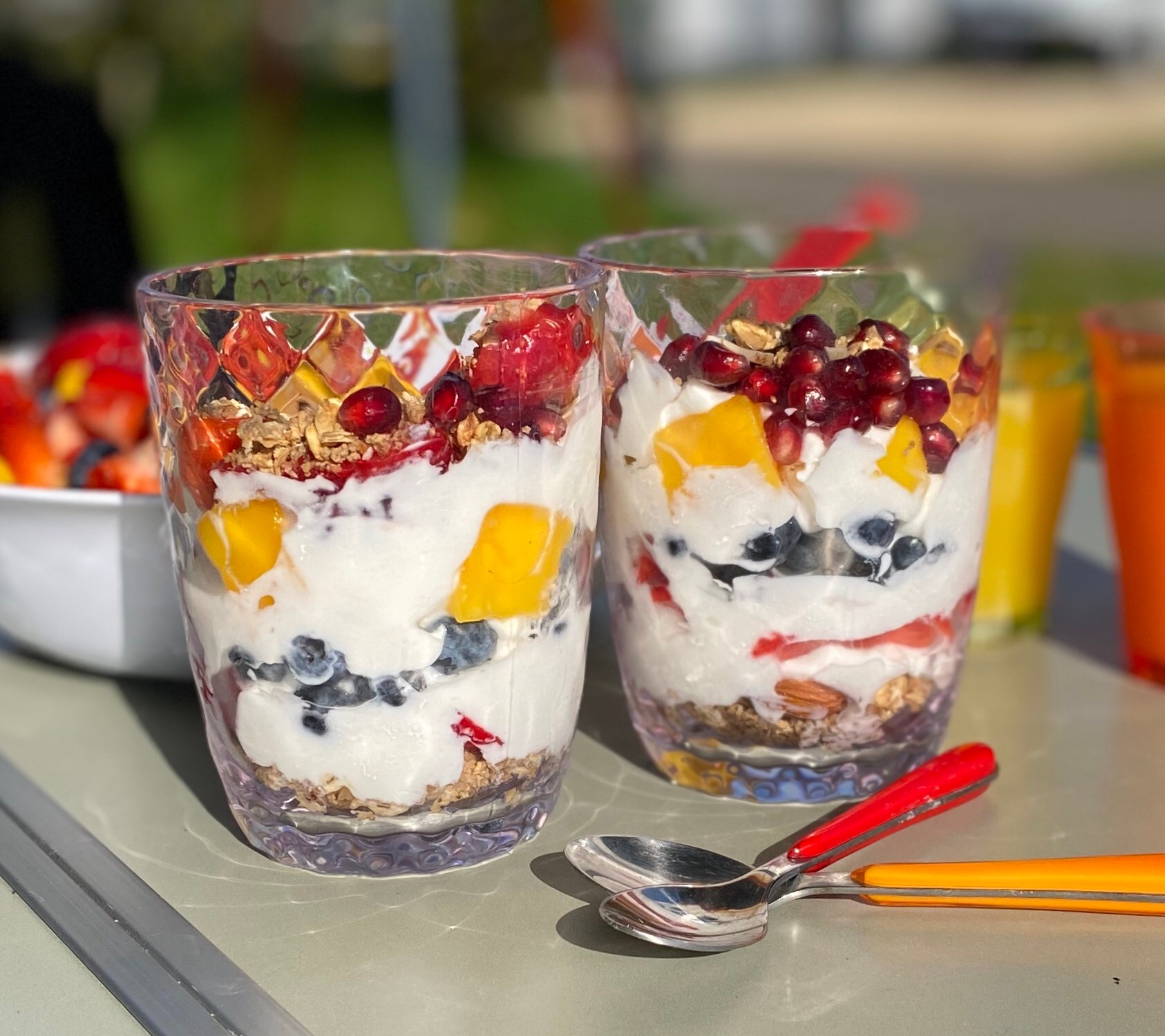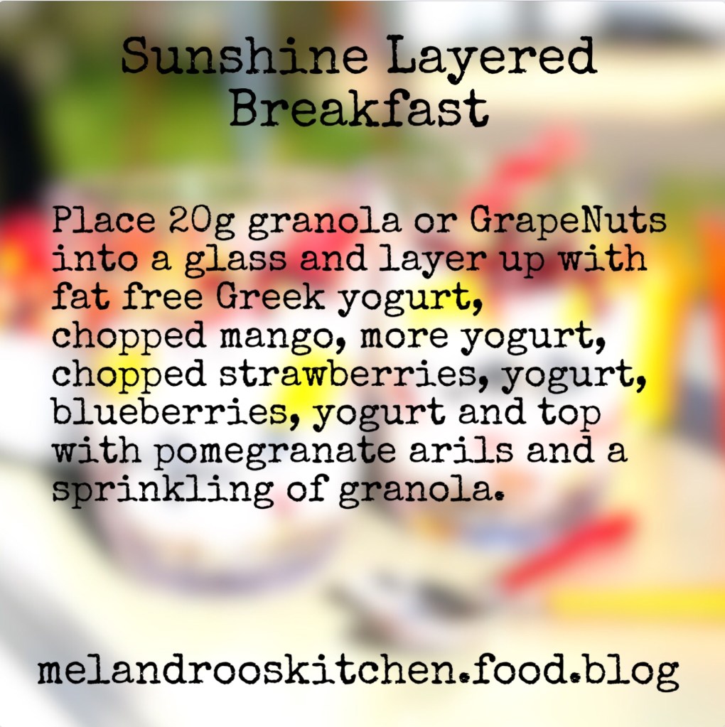 Not only is this pretty but it’s full of fresh fruits, protein rich Greek yogurt and granola or GrapeNuts for fibre.