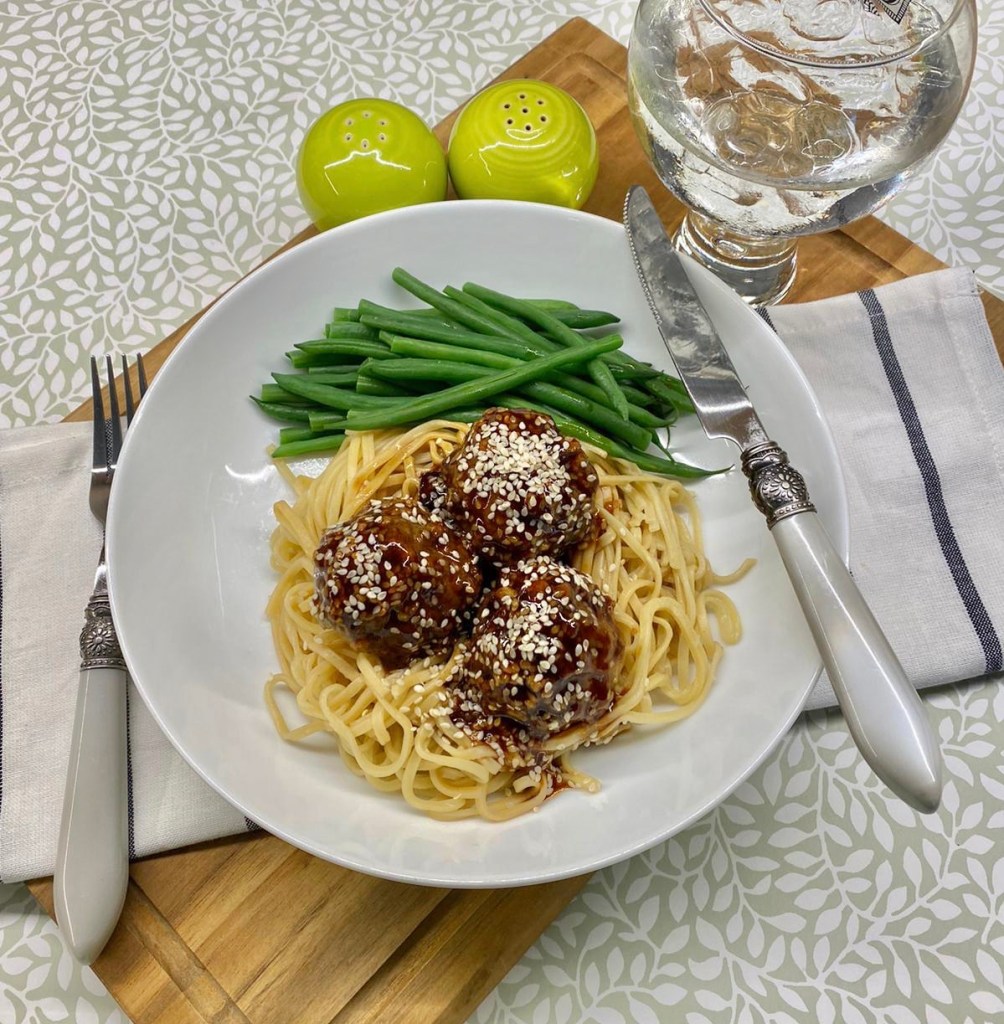 Meanwhile, whisk together the glaze ingredients, transfer to a wok or large frying pan set over a medium heat, bring to a simmer, add the cooked meatballs and heat together gently for 5 minutes until the glaze starts to thicken and the meatballs are coated.