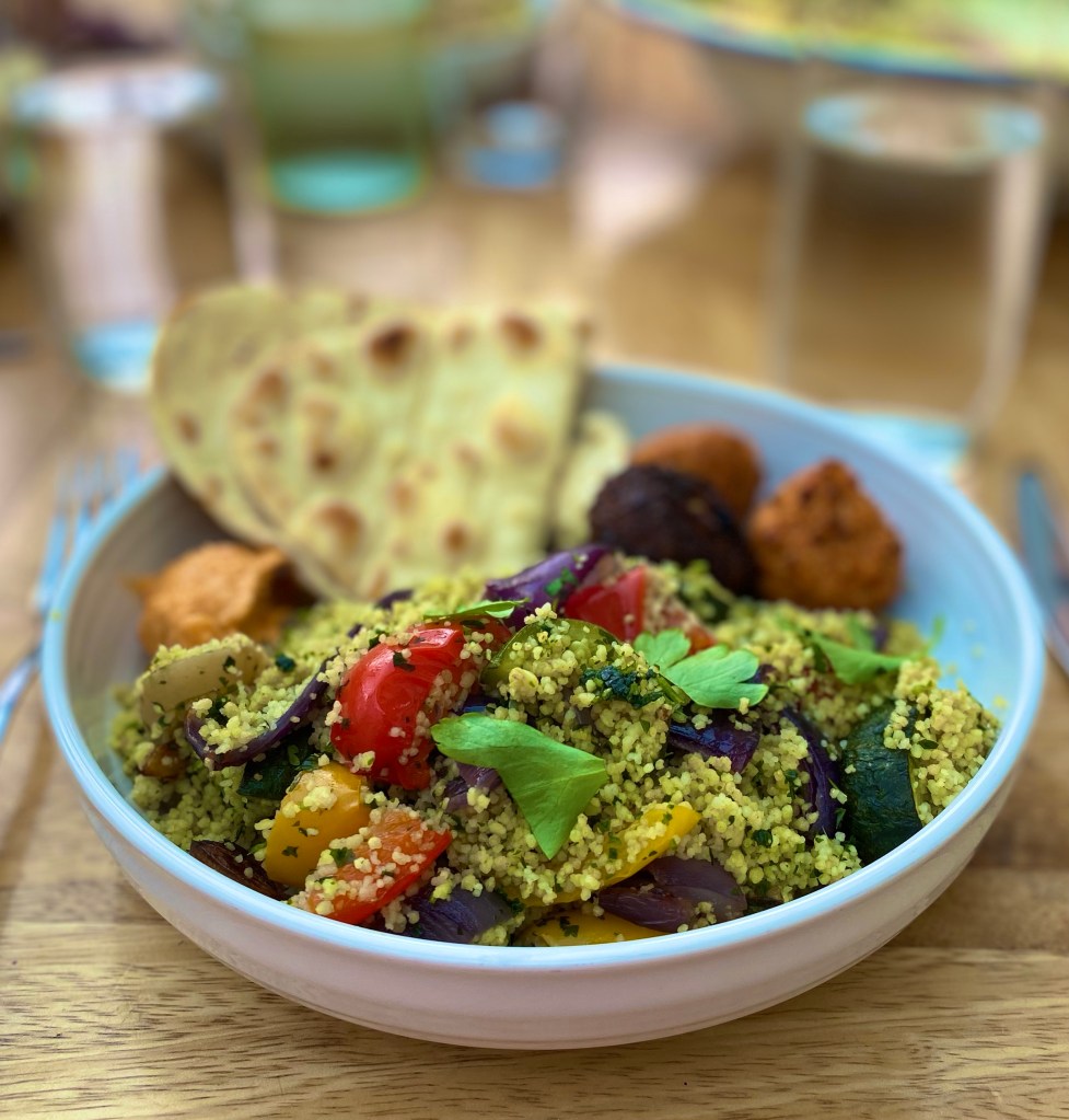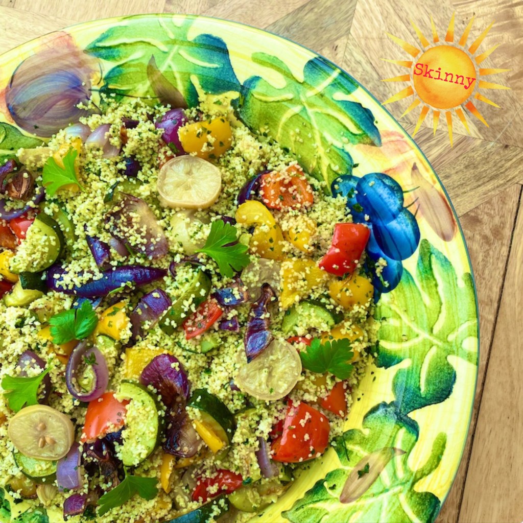 When the couscous is ‘cooked’, fluff with a fork and stir through the herb oil until fully combined, then stir through the roasted vegetables.