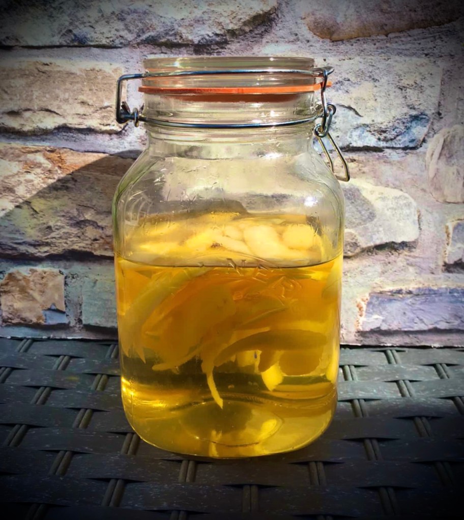 I used a large Kilner Jar, which I placed in a 160-degree oven for 10 minutes to sterilise it, if it has an orange rubber seal on it, place this in a bowl of boiling water for 10 minutes, do not put this in the oven or it will dry up and crack.