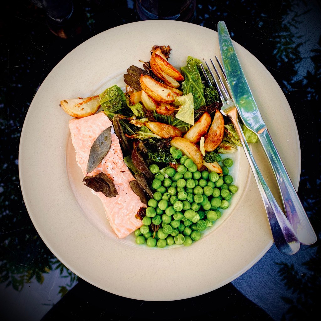 Meanwhile, mix together the remaining sage and cabbage or kale. Spray and massage through the leaves. Spread over the potatoes and then top with the salmon.