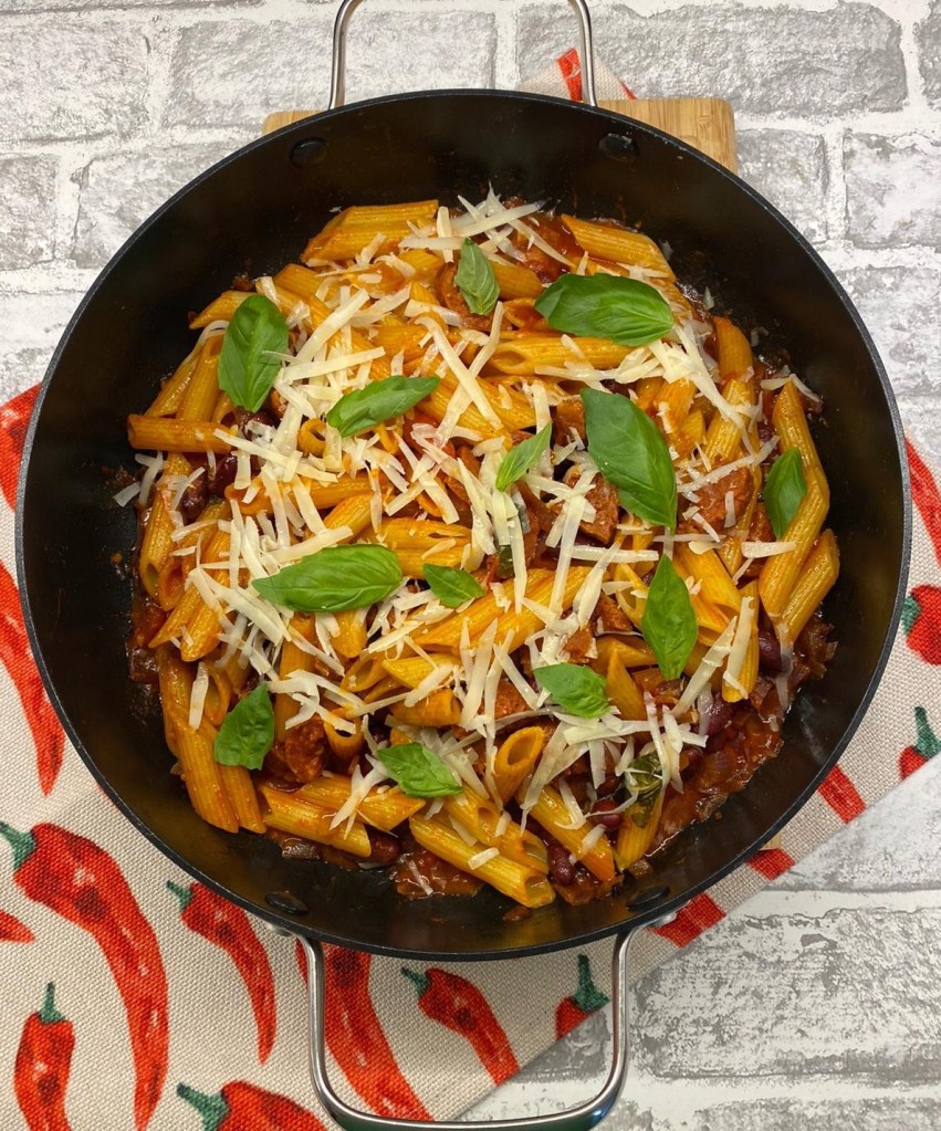 This quick, easy and tasty pasta dish will definitely be a family favourite. Pasta mixed with spicy chorizo sausage in a tomato and red onion sauce topped with basil and parmesan cheese.