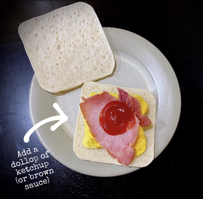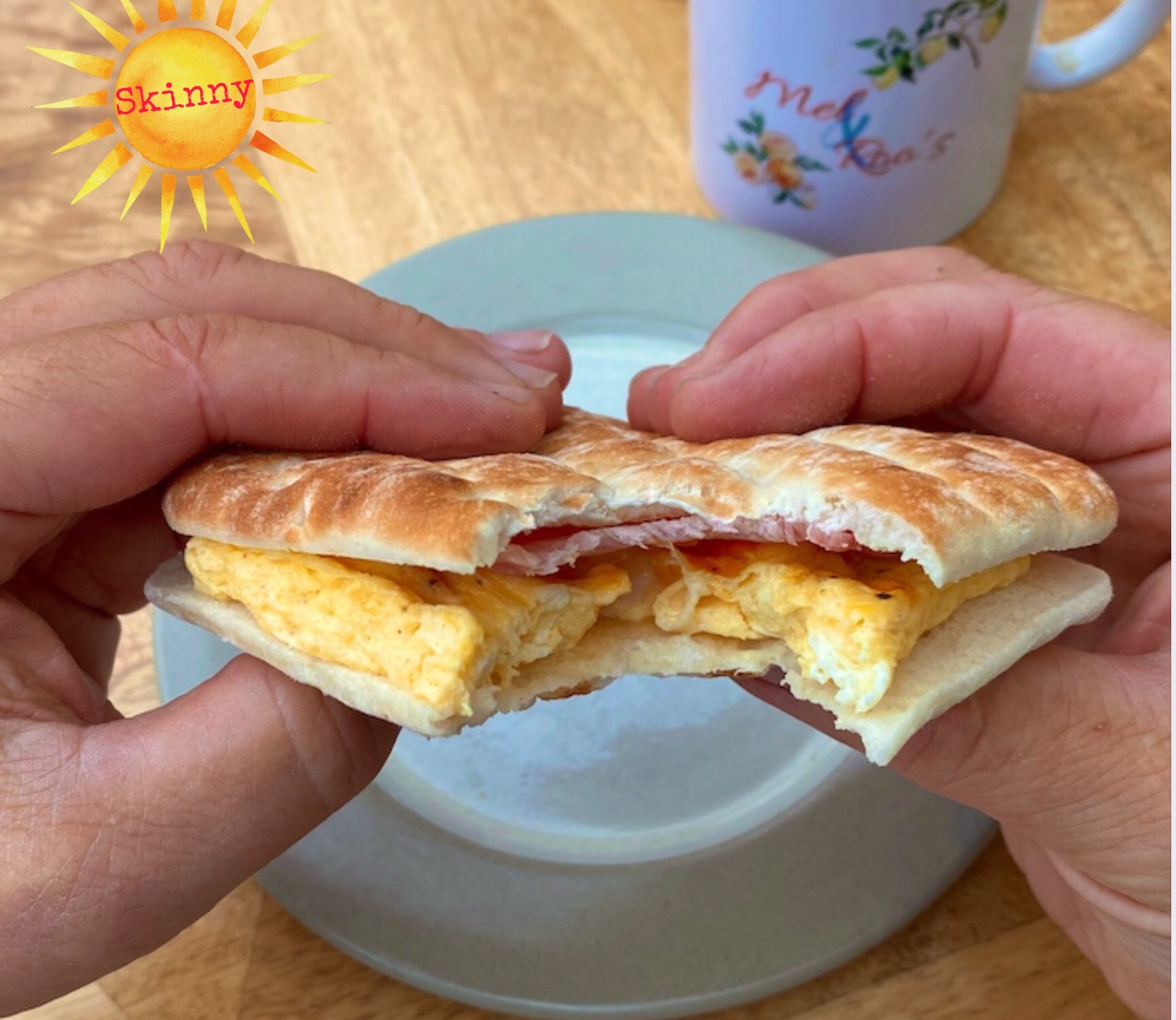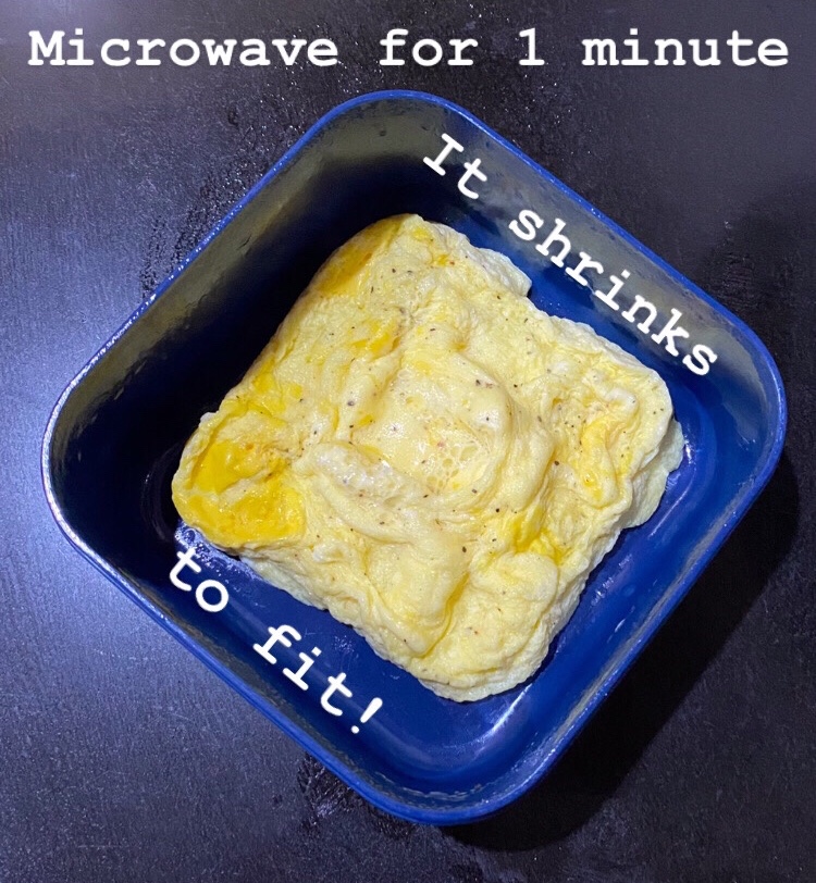 Just a splash of milk and spray your plastic container with a little cooking spray if you’re worried about it sticking (I didn’t bother and it was fine). Don’t worry if your ‘container’ is bigger than your sandwich thin, the egg shrinks to fit!