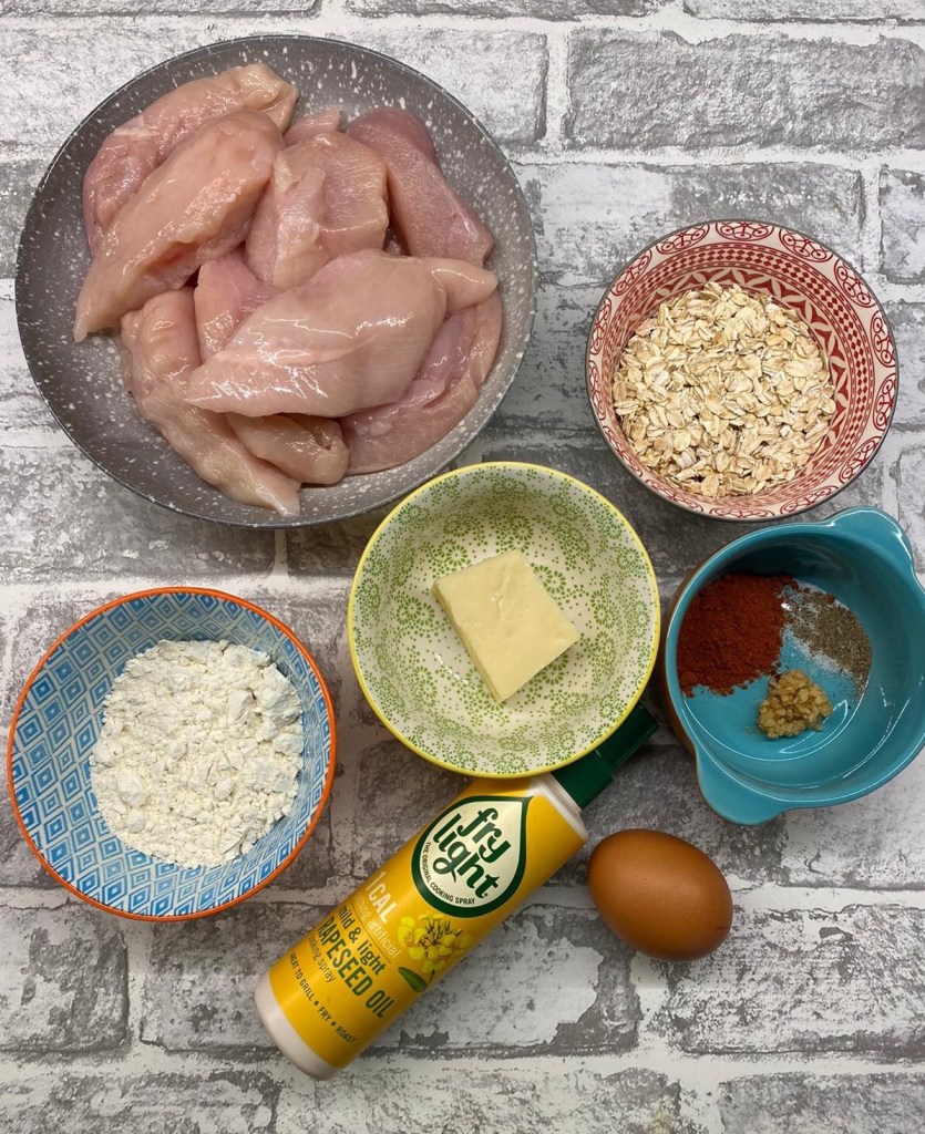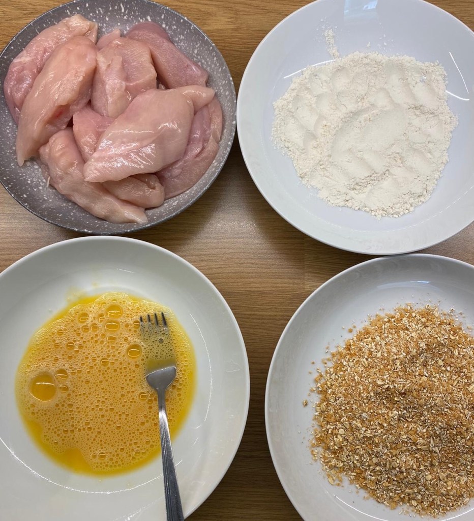 Dust the chicken with flour, then dip in the beaten egg then the crumb mixture turning until fully coated. Transfer to the baking trays and spritz with the low – calorie spray. Bake for 10 minutes then turn the chicken over and bake for a further 10 minutes until golden brown and the juices run clear with no pink meat. Lightly toast the rolls.