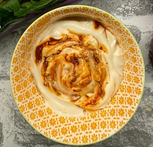 Stir together the yogurt, mayonnaise, mustard and rose harissa and place in a small bowl for serving.