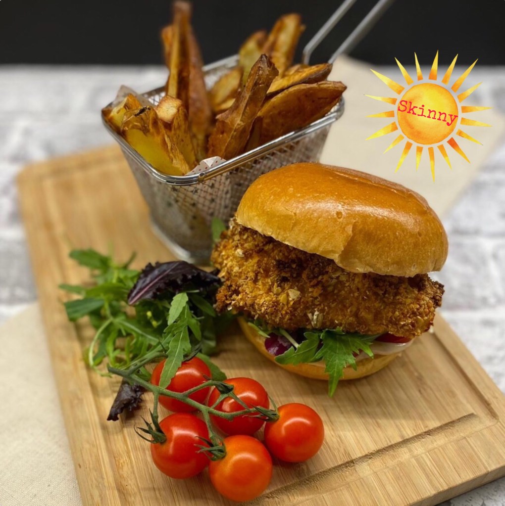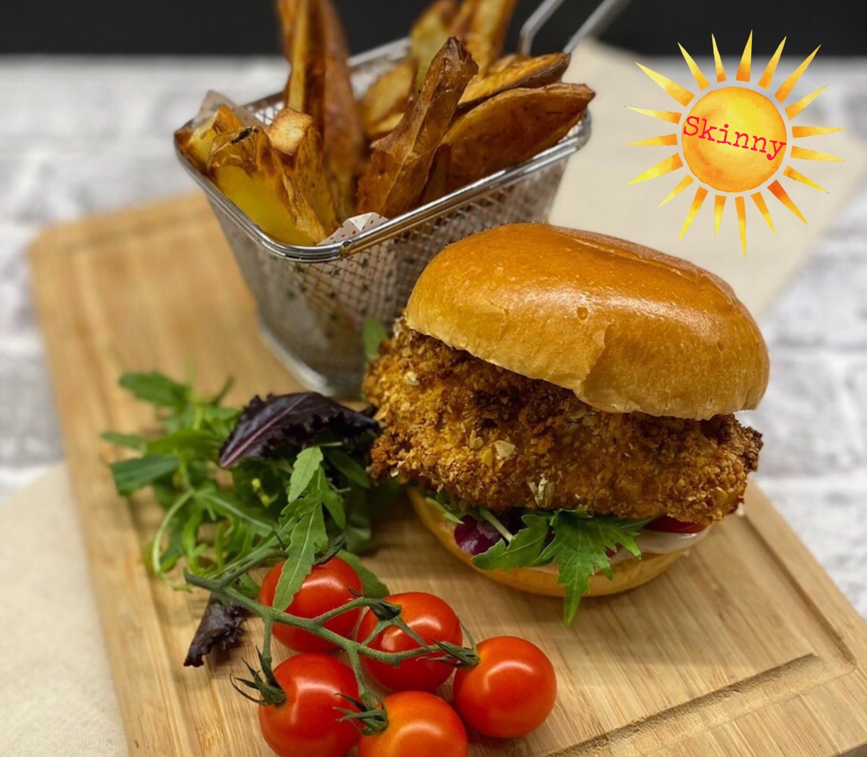Succulent pieces of chicken breasts coated in oats, garlic and smoked paprika and then gently baked in the oven. Served in a light brioche bun with lettuce, cucumber, tomato and red onion then drizzled with a low fat slightly spicy dressing.