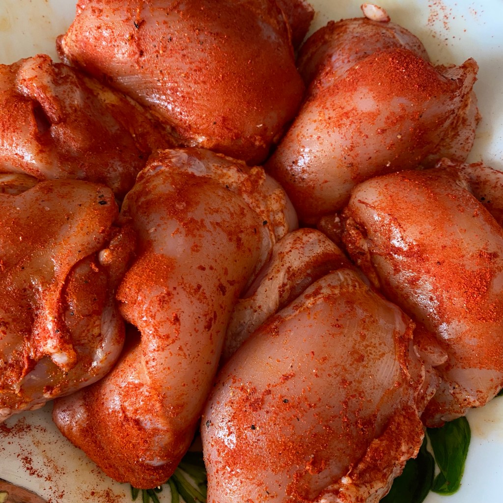 Arrange the chicken on a plate and dredge with the paprika and seasoning, toss to coat well and leave for a minimum of 30 minutes to marinade.