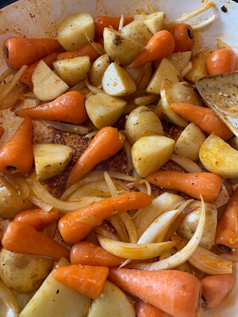 When you need a dinner that’s easy to construct and doesn’t create a war-zone in the kitchen, try this. Succulent chicken and lovely, soft vegetables that mash into the warm, comforting sauce. Yum!
