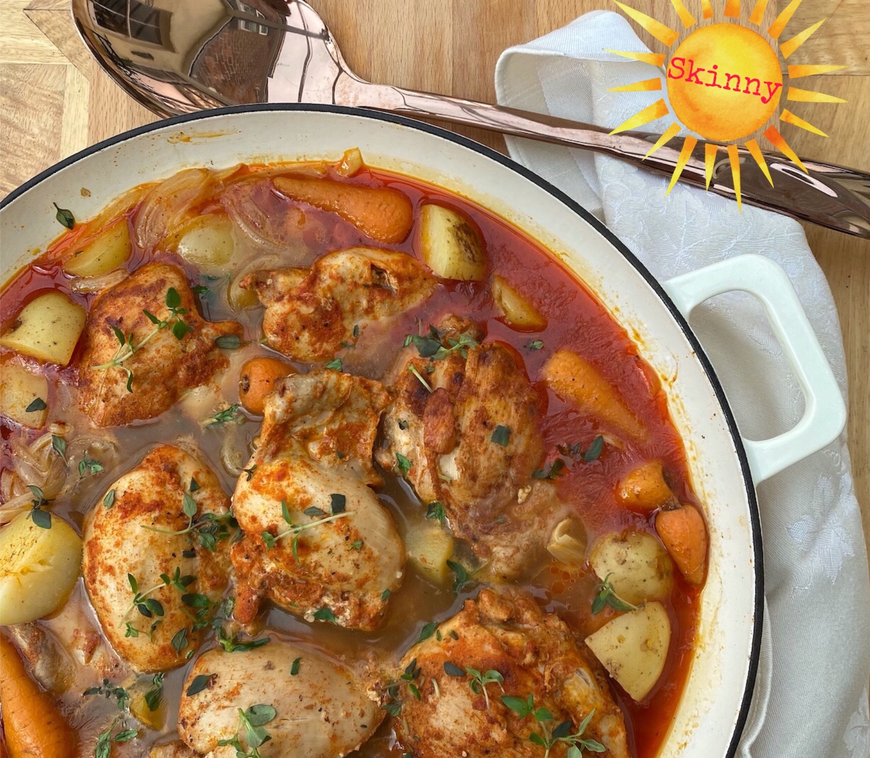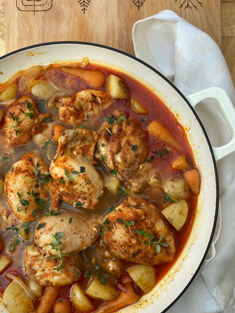 Cover the pan, reducing the heat to medium-low, and simmer for 30 minutes and until the chicken is cooked through and the vegetables are soft.