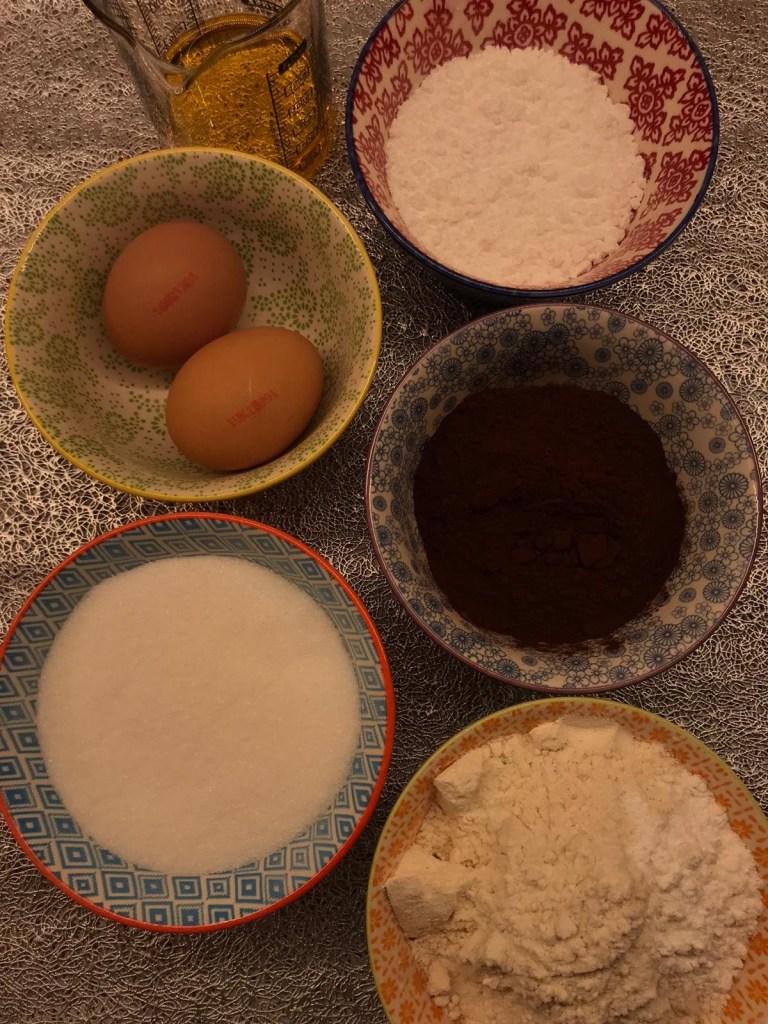 Mix the cocoa, caster sugar and oil together. Add the eggs one at a time, whisking until fully combines.
